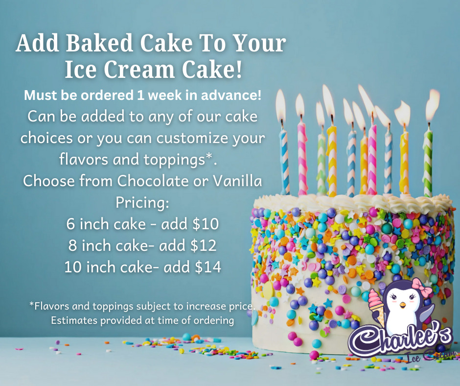 Hard ice cream cakes (subject to product availability): $10 up charge