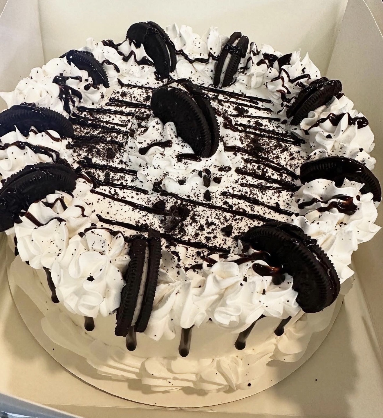 Two layers of vanilla ice cream, separated with a later of Oreos. Topped with cookies and cream frosting, chocolate syrup and Oreos.