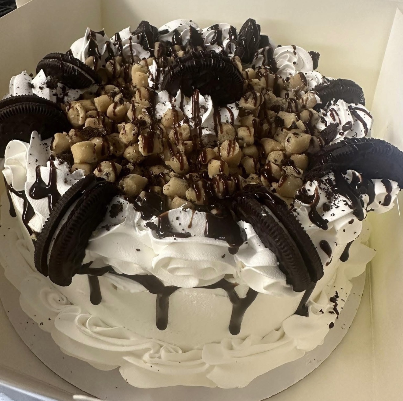 Customize your layers of chocolate and Vanilla ice cream. Separated by a layer of Oreo and cookie dough. Topped with chocolate syrup, Oreos, cookie dough, vanilla frosting, and cookie dough frosting!